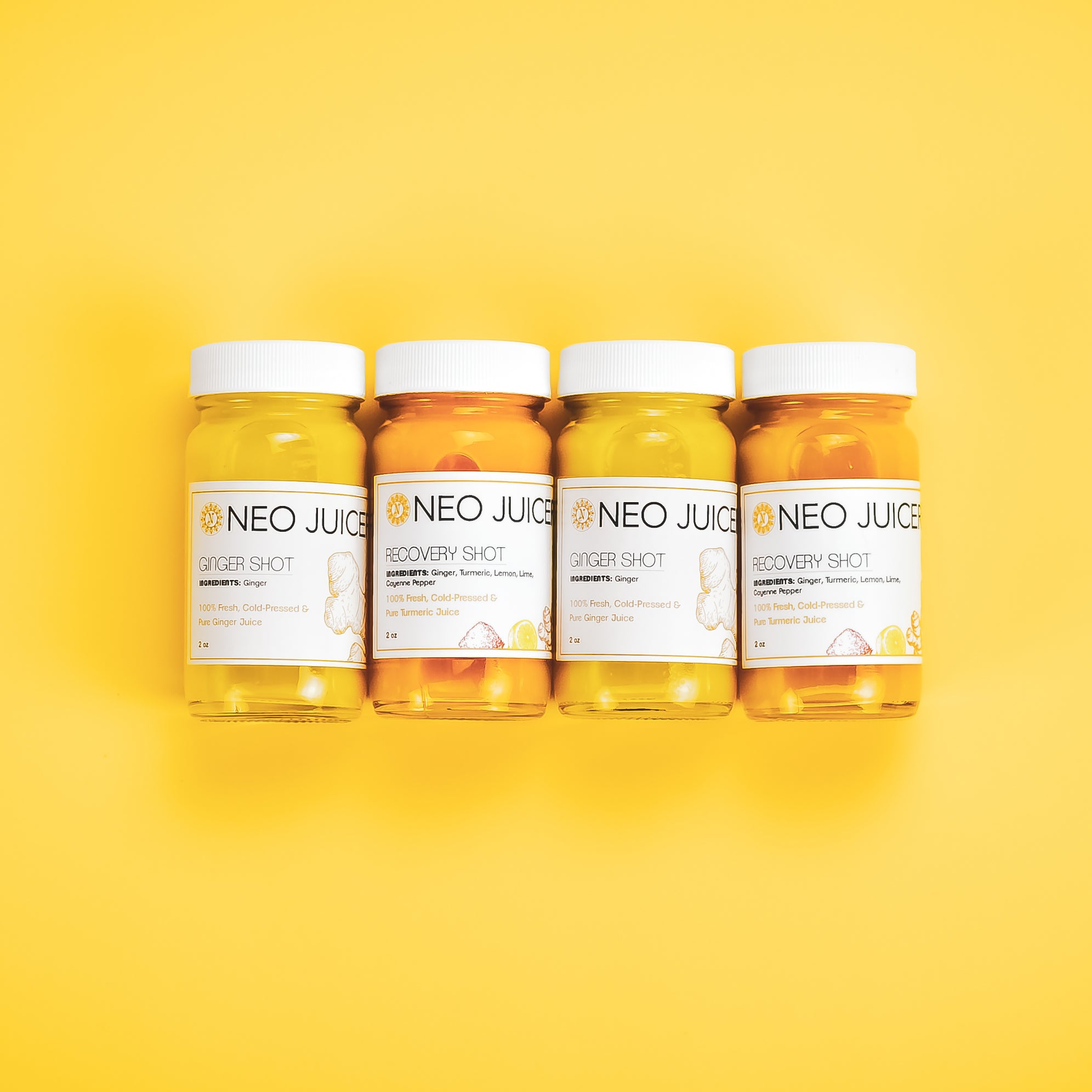 Cold-pressed juice shots for boosting your immunity, fighting the common cold, reducing inflammation and energizing your body with beneficial nutrients.